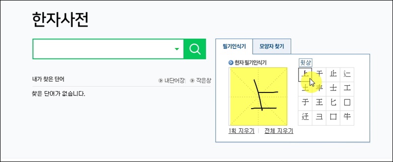 네이버 한자사전의 필기인식기를 사용하는 것이 어렵다면 다른 방법으로 한자 찾기를 해보세요. 옥편처럼 부수, 음, 총획수, 모양자를 이용하여 쉽게 찾아볼 수 있어요.
