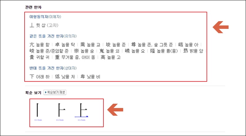 관련 한자인 이형동의자, 같은 뜻을 가진 한자, 반대 뜻을 가진 한자도 확인할 수 있어요. 모든 한자에는 획순이 있는데요. 온라인 한자사전을 통해 획순 보기도 가능해요. 영상으로도 볼 수 있으니 참고해 주세요.