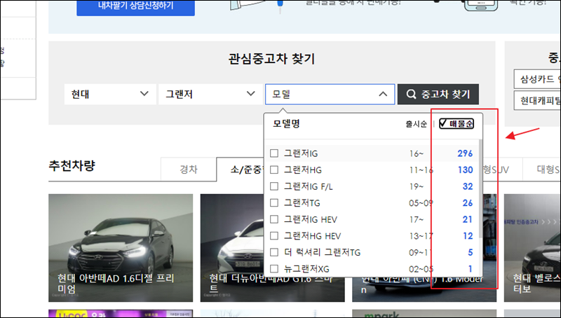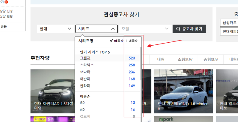 브랜드를 선택한 다음에는 시리즈를 선택해 주세요. 현대자동차에서 중고차 인기 시리즈는 그랜저, 스타렉스, 쏘나타, 아반떼, 싼타페가 있네요. 매물이 가장 많은 그랜저를 선택해 볼게요.