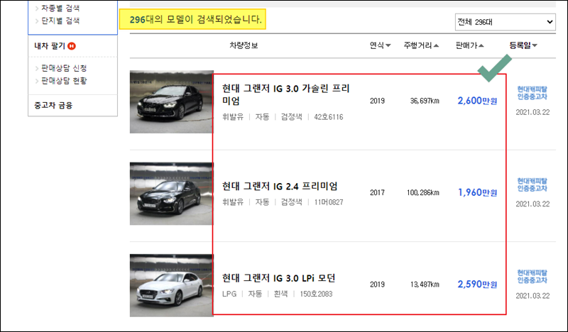 그랜저IG 중고차 매물이 296대나 검색이 되었어요. 리스트를 통해 사진, 차량정보, 연식, 주행거리, 등록일, 판매가, 연료 타입, 자동 및 수동 여부, 차량 색상, 중고차 번호를 살펴볼 수 있는데요.