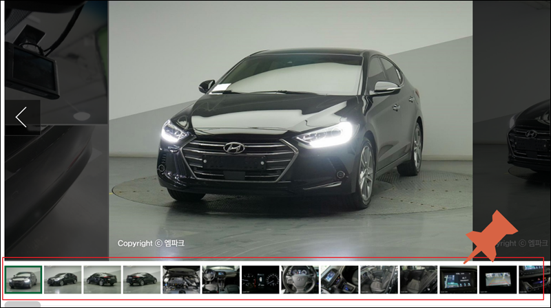 리스트에서 마음에 드는 중고차 매물을 클릭해 보세요. 그럼 이렇게 많은 사진을 찾아볼 수 있어요. 외관은 물론이고, 내부가 얼마나 깔끔한지 살펴볼 수 있어요.