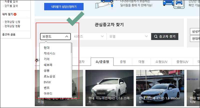 중고차 검색 페이지가 열리면 가장 먼저 해야 할 것은 브랜드를 선택하는 일이에요. 아무래도 1500만원대로 저렴한 매물을 구한다면 국산 브랜드를 선택하는 것이 좋아요. 매물이 많아서 1500만원대 중고차를 구할 가능성이 높죠.