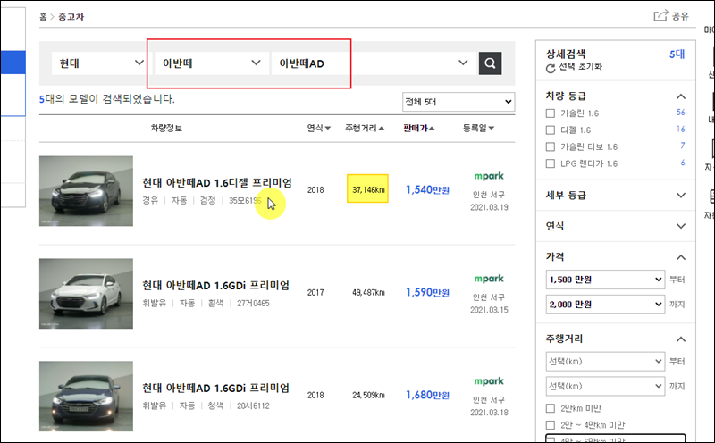 이런 경우에는 시리즈와 모델을 변경해 보세요. 저는 아반떼AD로 변경했는데요. 1500만원대에 속하는 중고차 매물 중에서 주행거리가 짧은 것이 있네요.