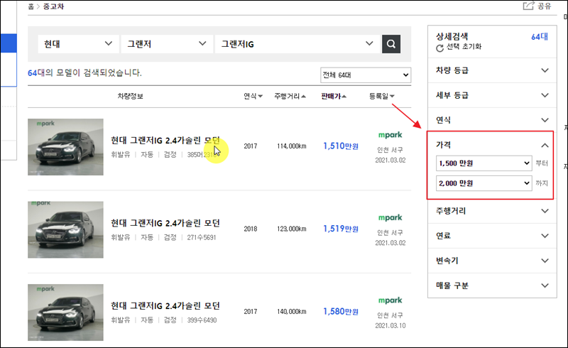 1500만원대 매물을 찾아보기 위해서는 우측에 있는 상세검색 기능을 사용하면 편해요. 상세검색 기능을 통해서 차량 등급, 세부 등급, 연식, 가격, 주행거리, 연료 타입 등의 조건을 설정할 수 있는데요. 가격에서 1500만원대를 기준으로 설정해 볼게요. 조건을 지정하니 64대의 매물이 검색되었는데요. 주행거리가 너무 기네요.