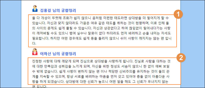 마지막으로 긴 글로 된 궁합 정리를 읽어볼 수 있는데요. 어떻게 해야 좋은 상대를 만나거나 인연을 오래 유지할 수 있는지 알려줘요. 문제가 생길 여지도 알려주기 때문에 조심해야 할 부분을 조언해 주기도 하죠.