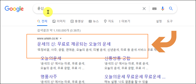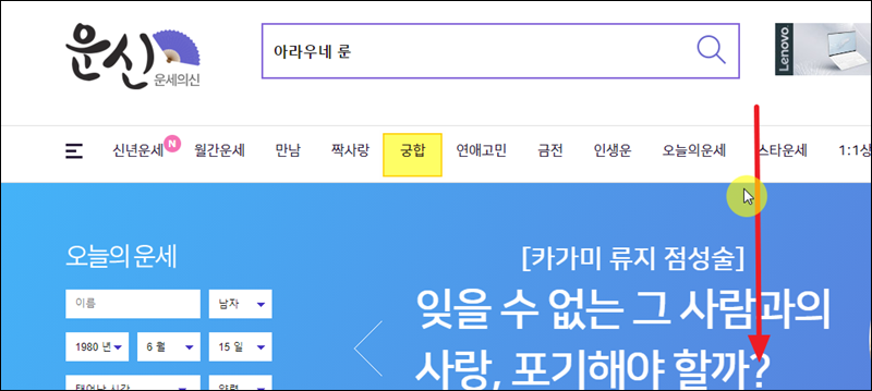 운신 사이트에 접속했어요. 메뉴를 보면 신년운세, 월간운세, 만남, 짝사랑, 궁합, 금전, 인생운, 오늘의 운세 등 재미있어 보이는 역술 서비스가 많이 보이는데요. 여기서 메뉴를 선택하지 마시고, 화면을 쭉 아래로 내린 후 "더 보기" 버튼을 클릭해 주세요.