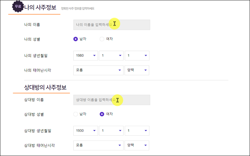 새롭게 열린 페이지에서 궁합보기 위해 가장 먼저 할 일이 있어요. 나와 상대방의 사주정보를 입력하는 일이에요. 점집에서도 궁합보기 위해 해당 정보를 제공해야 해요. 이름, 성별, 생년월일, 태어난 시각 이렇게 4가지를 입력하면 무료로 풀이를 볼 수 있어요.