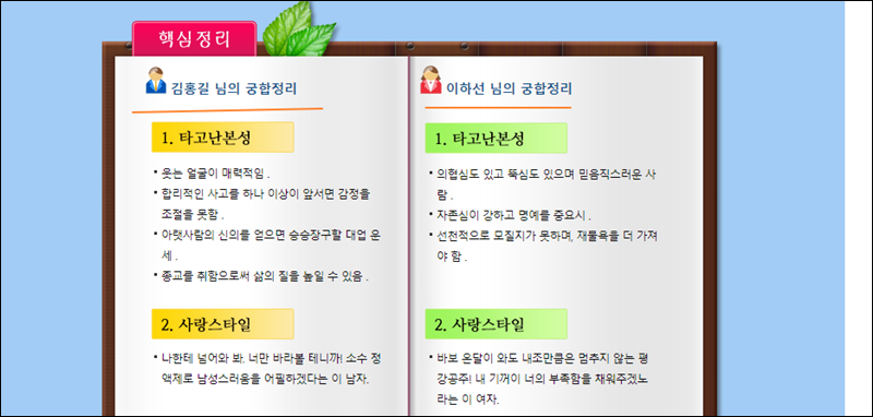 이제부터 상세한 해석을 기반으로 궁합보기를 할 수 있는데요. 가장 먼저 타고난 본성과 사랑스타일이에요. 본성이 서로 비슷하거나 어우러지면 좋겠죠? 거기에 더하여 사랑스타일도 죽이 맞으면 좋고요.