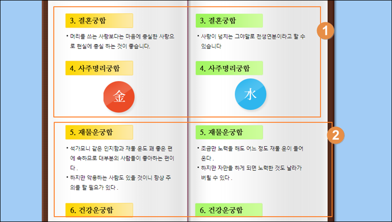 총평 외에도 타고난 성격, 건강운, 애정운, 재물운, 결혼운을 기반으로 서로에 대한 무료 궁합보기 진행이 가능한데요. 내용이 꽤 많아서 시간적으로 여유가 있을 때 이용하는 것을 추천해요.