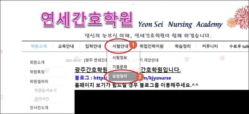 연세간호학원 사이트에 접속했어요. 메뉴에서 "시험안내"를 선택해 보세요. 그럼 시험정보, 기출문제, 요점정리 이렇게 3가지 메뉴가 나타나는데요. 여기에서 세번째인 요점정리를 선택해 주세요.