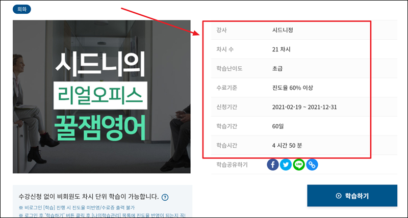 사이트 안내문에 나와 있듯이 수강신청을 하지 않아도 경기도 지식 사이트에서 제공하는 강의를 들을 수 있어요. 회원가입 또한 필요 없이 비회원으로 들을 수 있고요.