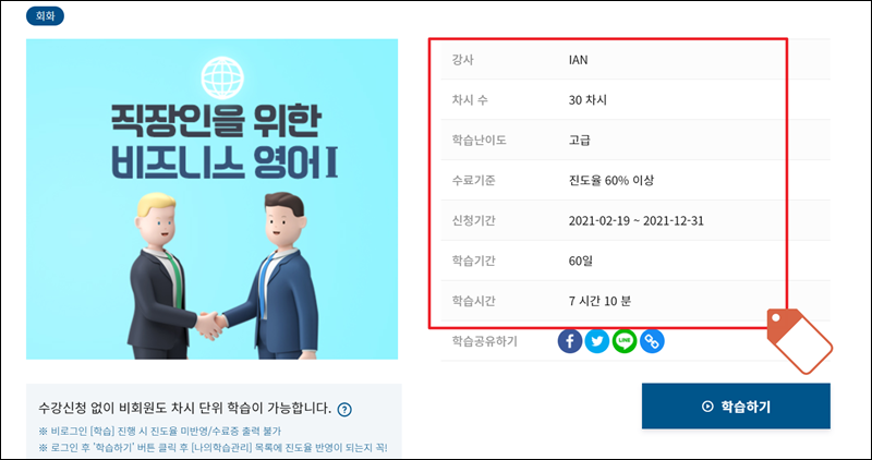 직장인을 위한 비즈니스 영어를 선택해 보았어요. 총 30차시로 이루어져 있고, 모두 학습하는 대에 7시간 10분이 걸린다고 하네요.