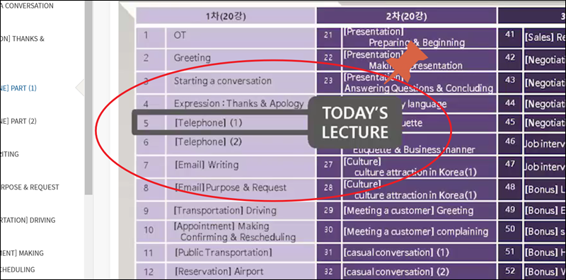 비즈니스 영어회화의 경우 전화, 이메일, 약속, 예약 등 여러 가지로 나뉘는데요. 그 중에서 전화영어는 핵심이라고 할 수 있어요. 기초적이지만, 제대로 대처하지 못하면 사람을 당혹스럽게 만드는 일이기도 하죠. 다음은 무료로 이용할 강의의 학습 목차인데요. 여기에 전화영어도 포함이 되어 있어요.