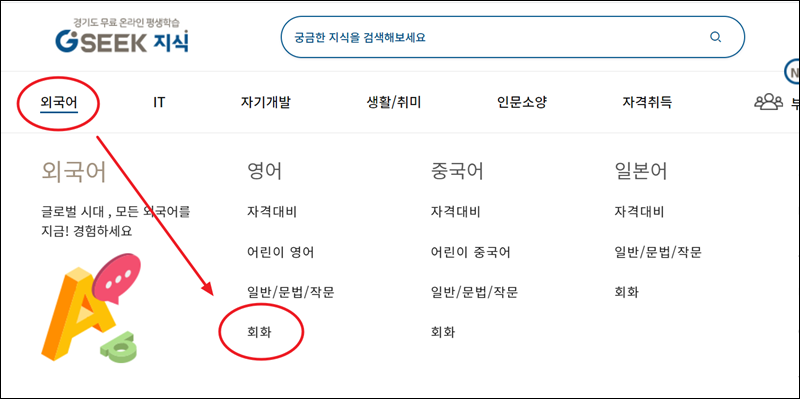 경기도 지식 사이트에서 비즈니스 영어회화 강의를 찾아볼게요. 메뉴를 보면 외국어, IT, 자기개발, 생활, 취미, 인문소양 등을 선택할 수 있는데요. 외국어를 클릭해 보면 영어는 물론이고, 중국어와 일본어까지 배울 수 있게 되어 있어요. 일단 비즈니스 전화영어 강의를 듣기 위해 "영어 회화"를 선택해 주세요.