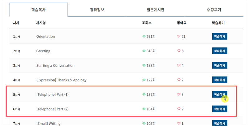 강의를 듣기 전에는 학습목차를 살펴보면 좋은데요. 해당 강의의 경우 5차시와 6차시가 비즈니스 전화영어 공부를 하기에 적합하네요. 해당 차시에 있는 "학습하기"를 클릭해 보세요.