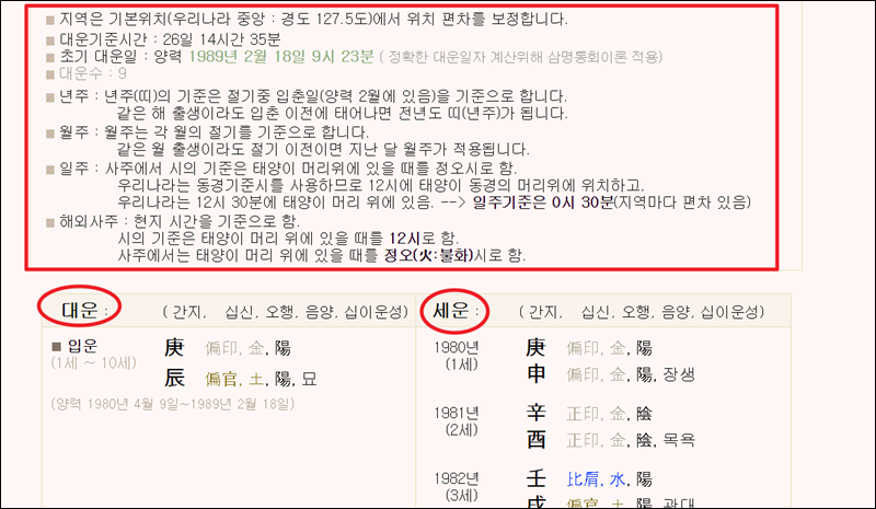 다음으로는 만세력 사이트에서 주로 많이 보는 대운과 세운인데요. 대운은 10년 마다 바뀌는 운을 의미하고, 세운은 1년마다 바뀌는 운이에요. 토정비결처럼 상세한 해석이 없어서 조금 아쉬운 면이 있어요.