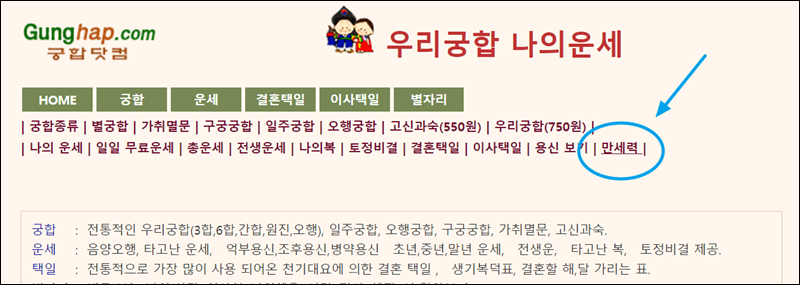 우리궁합 나의운세 홈페이지에 접속했어요. 앞서 언급한 바와 같이 무료로 볼 수 있는 궁합, 운세, 택일 서비스가 보이는데요. 메뉴에서 가장 우측을 보면 만세력 메뉴가 있어요.