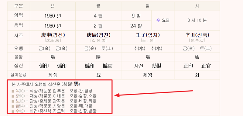 바로 오른편에 있는 내용을 통해 만세력 풀이를 만나볼 수 있어요. 긴 문장으로 상세하게 적혀 있는 내용은 아니지만, 만세력 결과가 무엇을 의미하는지 알기 쉽게 되어 있어요.
