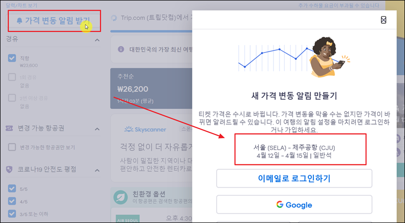 제가 알려드린 바와 같이 따라 했음에도 불구하고 마음에 드는 땡처리 비행기표를 구하지 못할 수 있습니다. 성수기 기간인 경우 더욱 그러한데요. 이럴 때에는 "가격 변동 알림 받기" 기능을 사용해 보세요. 이를 통해 갑자기 생긴 땡처리 티켓에 대한 알림을 받을 수 있습니다. 알림 받고 바로 비행기표 예매를 진행하면 됩니다.