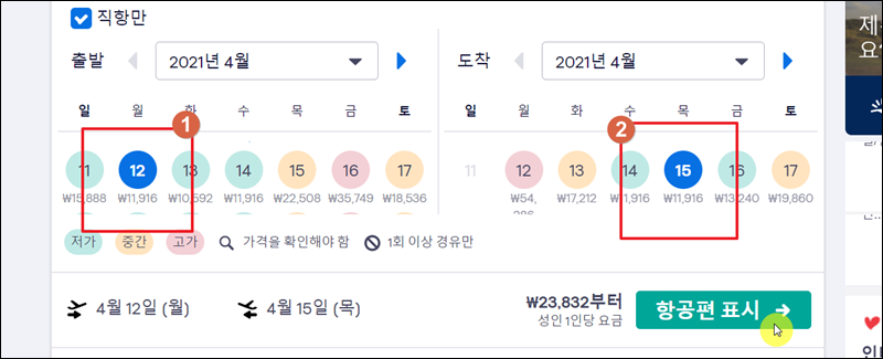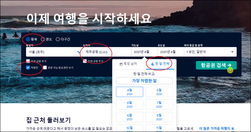 스카이스캐너 메인화면에서 날짜를 선택할 때 "한 달 단위"로 지정을 한 경우 해당 월의 일별 최저가 비행기표 가격을 확인할 수 있습니다. 그럼 땡처리 비행기표를 구하기가 좀 더 수월해집니다. 땡처리 상품 특성상 출발 날짜가 가까워지면 싸게 예약을 할 수 있습니다. 그렇기 때문에 가급적 먼 날짜가 아닌 가까운 날짜의 티켓을 검색해보는 것이 땡처리 상품을 구하기에 적합합니다.