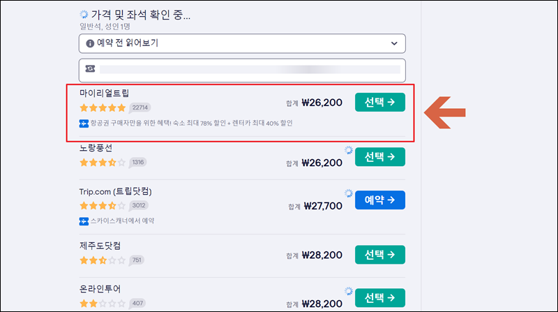 마음에 드는 티켓을 찾아서 "선택" 버튼을 눌렀다면 예약을 진행할 사이트를 선택하는 화면이 나타납니다. 가격이 저렴하면서 평점이 높은 곳을 선택하면 됩니다.