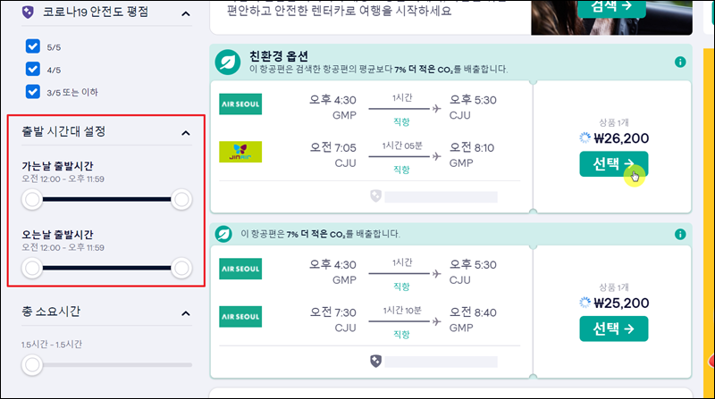 이번에는 출발 시간대 설정을 해주어야 합니다. 비행기 탑승 시간을 정하는 것인데요. 탑승 시간에 따라 땡처리 비행기표의 가격이 달라집니다. 마음에 드는 시간대의 비행기표를 찾았으면 "선택" 버튼을 눌러 예약을 진행해 주세요.