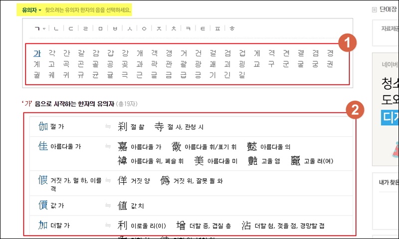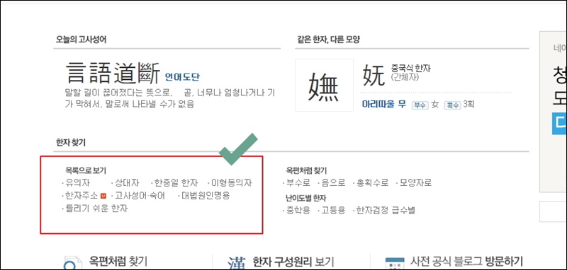 사전 사이트에 접속했어요. 메인화면에서 화면을 쭉 아래로 내려보세요. 그럼 여러 가지 한자 찾기 서비스가 나타나는데요. 여기서 목록으로 보기 카테고리에 있는 유의자를 클릭해 주세요.