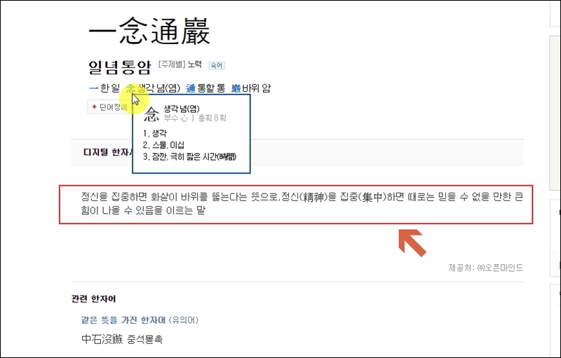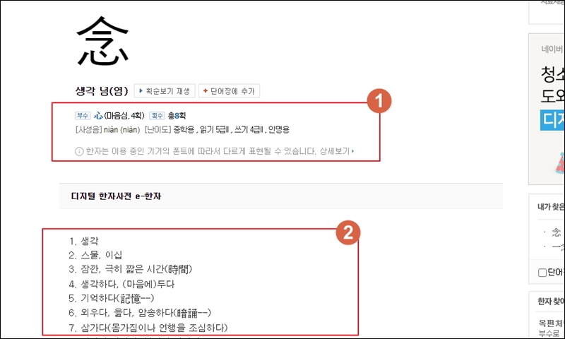 고사성어에 포함된 각 한자를 클릭하면 해당 문자에 대해 자세히 살펴볼 수 있는데요. 새롭게 열린 페이지를 통해 부수, 획수, 여러 가지 뜻을 확인할 수 있어요. 이렇게 깊게 알아보는 것도 학습효과가 있어요.
