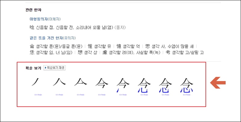 여기서도 이형동의자나 유의자를 확인할 수 있는데요. 첫 번째로 알려드린 한자 외우는법에서 설명한 대로 함께 외우면 더 빨리 암기가 가능해요.