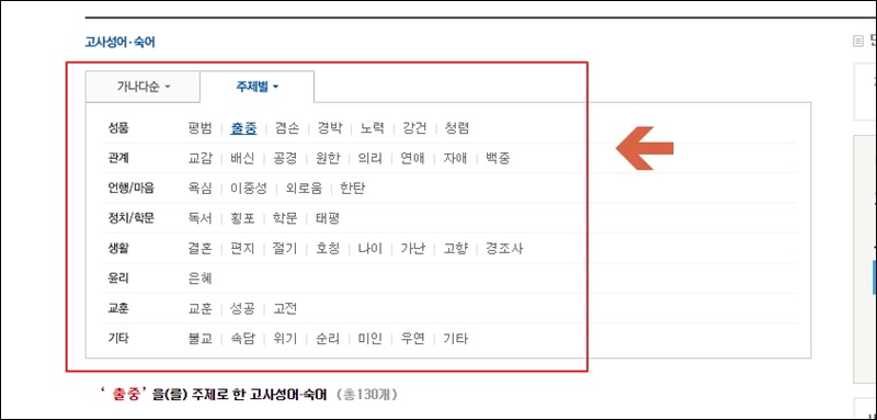 한자 외우는법 두 번째는 고사성어나 숙어를 이용하는 방식이에요. 주제별로 고사성어를 찾아볼 수 있게 되어 있는데요. 주제별로 보면 성품, 관계, 언행, 정치, 생활, 윤리, 교훈 등으로 구분이 되어 있어요. 관심 있는 것에 관련된 고사성어를 선택해 주세요. 관심이 있어야 한자 외우는 것에 재미를 붙일 수 있어요.