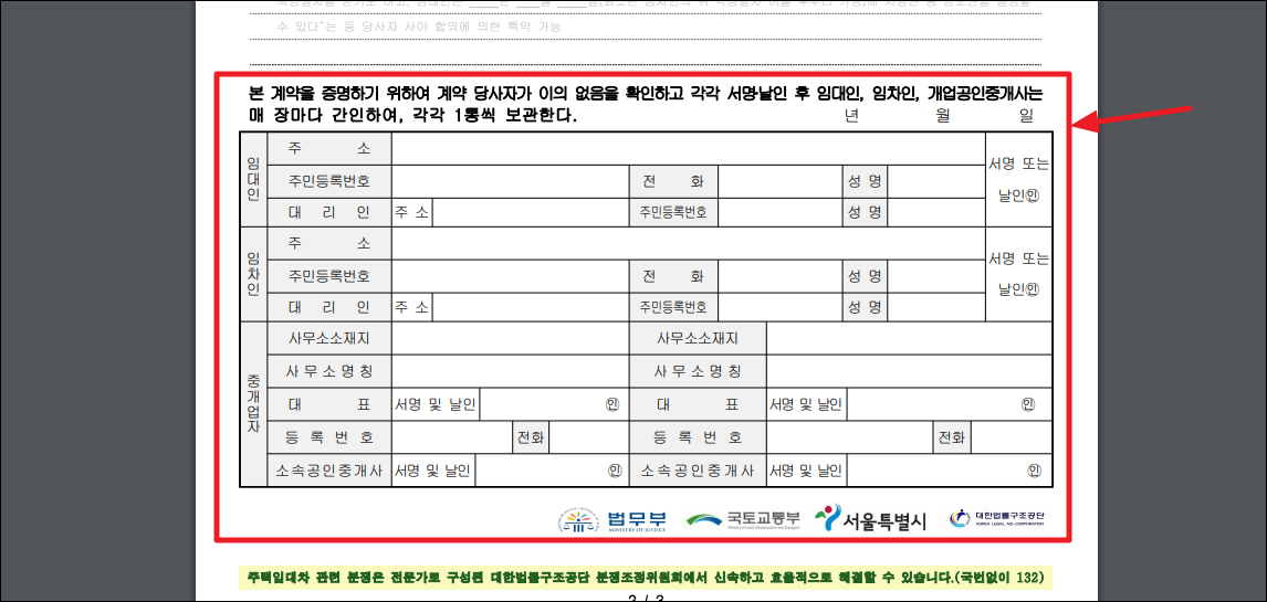 이런 식으로 표준 양식을 이용하면 작성하는 것은 어렵지 않은데요. 아무래도 전문가가 아니기 때문에 중요한 부분을 놓칠 수 있어요. 그런 문제를 예방하기 위해 중개업자의 도움을 받아 작성하는 것이 안전해요.