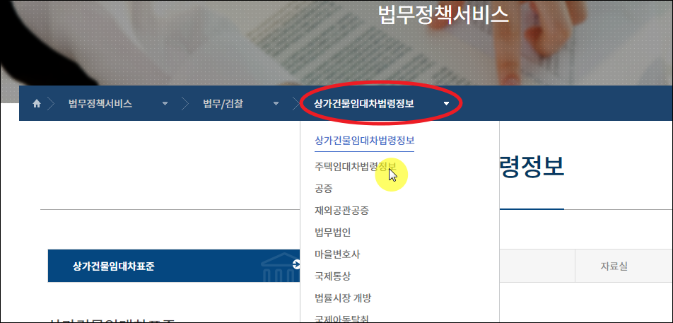 법무부에서 제공하는 표준 임대차계약서 양식은 2가지가 있는데요. 상가건물용과 주택용이에요. 새롭게 열린 페이지에서 메뉴 선택을 통해 이용하고자 하는 임대차계약서 종류를 선택해 주세요.