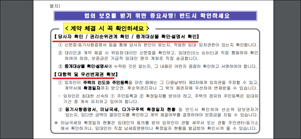 표준 양식 뒷면을 보면 별지가 있는데요. 계약을 체결할 때, 계약기간 중, 계약종료 시 확인해야 할 사항에 대해 다루고 있어요. 이러한 것을 숙지하고 있으면 안전하게 계약을 진행하는 데에 도움이 될 거에요.