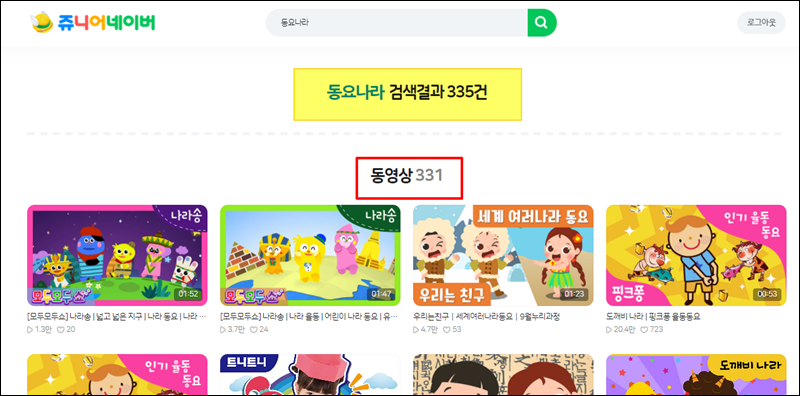 동요나라 곡을 원한다면 쥬니어 네이버 사이트 상단에 있는 검색창에 "동요나라"를 입력한 후 엔터키를 눌러보세요. 그럼 335건의 동요나라 콘텐츠를 만나볼 수 있어요.