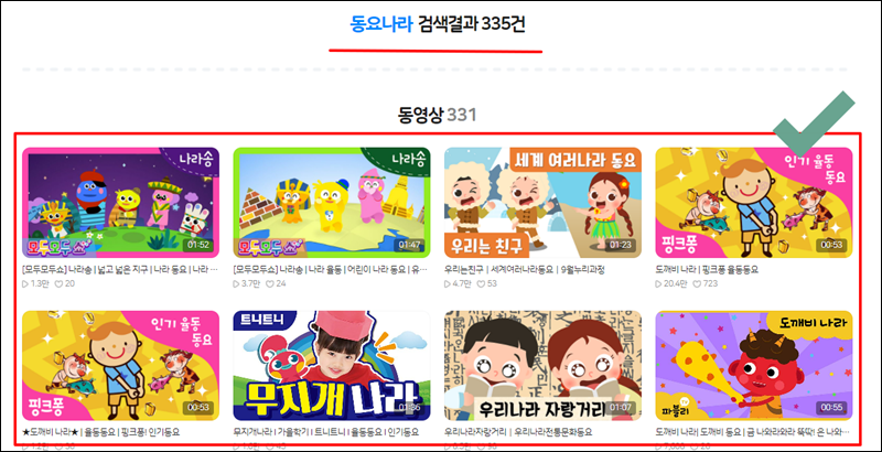 제가 자주 이용하는 사이트에서 아이들이 재미있게 들을 수 있는 동요나라 곡 모음을 검색해 보았어요. 300개 이상의 곡을 들을 수 있는데요. 모두 동영상 콘텐츠로 되어 있기 때문에 아이들이 재미있어해요. 가사도 나오기 때문에 따라 부르기 좋고요.