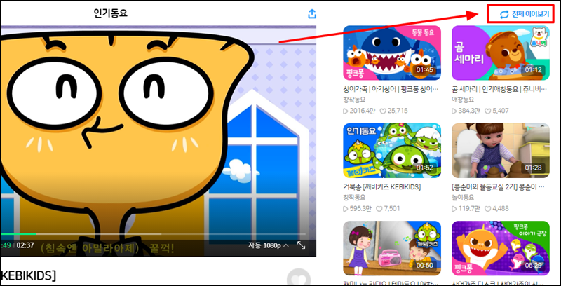 동요 특성상 3분 이내로 끝나는데요. 일일이 곡을 선택해서 들려주기 힘들 수 있어요. 이럴 때에는 사이트 우측 상단에 있는 "전체 이어보기" 버튼을 클릭해 주세요. 그럼 무료동요 연속듣기 서비스를 이용할 수 있어요.