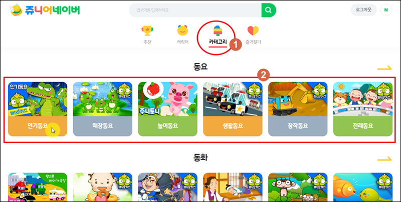 쥬니어 네이버 사이트에 접속했어요. 메인화면 상단을 보면 추천, 케릭터, 카테고리, 즐겨찾기와 검색창이 있는데요. 여기에서 카테고리 메뉴를 선택해 보세요. 그럼 가장 먼저 동요 콘텐츠가 나타나요. 인기곡 모음, 애창곡, 놀이동요, 생활 및 창작동요, 전래동요 등을 이용할 수 있어요.