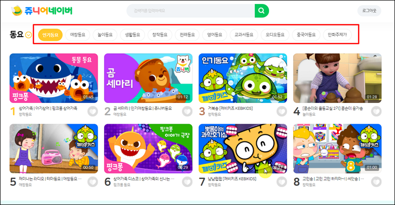 인기 있는 동요 곡 모음이 나타났어요. 요즘 아이들에게 인기 있는 상어가족, 곰 세마리, 거북송, 콩순이 응가송, 재미나느 라디오, 상어가족 디스코 등이 보이네요. 클릭하면 바로 감상이 가능해요.