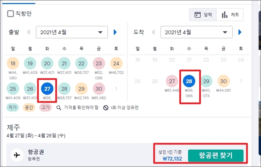 해당 정보를 통해 어느 날짜에 가장 저렴한 저가항공권을 예매할 수 있는지 알 수 있죠.