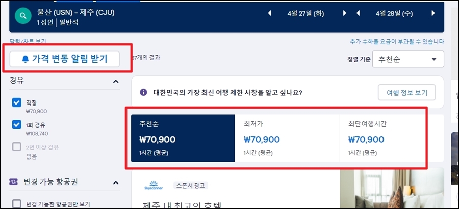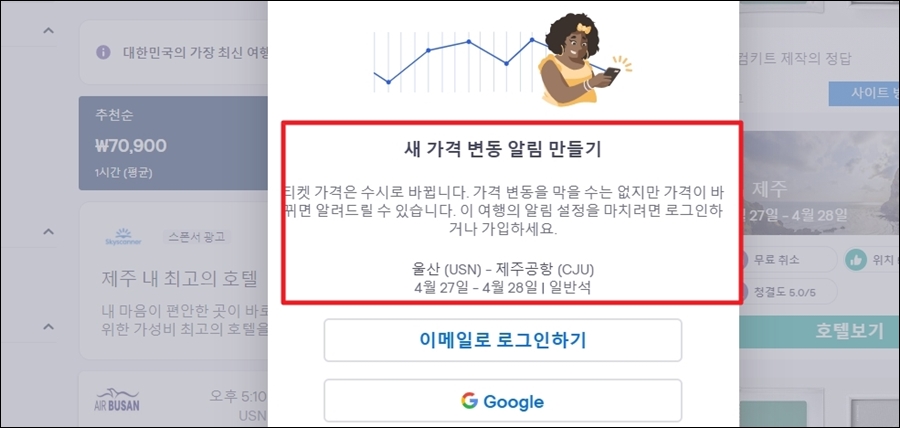 제주도를 포함한 티켓 가격은 수시로 변합니다. 해당 서비스를 이용하면 가격이 낮아졌을 때 알림을 받을 수 있습니다.