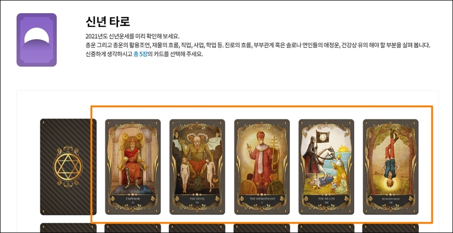 정통 운세와 다르게 사주 정보를 입력하는 대신 카드를 뽑아서 점을 봅니다.