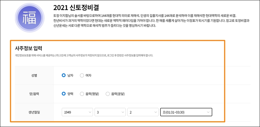 토정비결은 사주 정보인 성별, 태어난 날짜와 시각을 가지고 한 해의 운을 살펴보는 역술입니다.