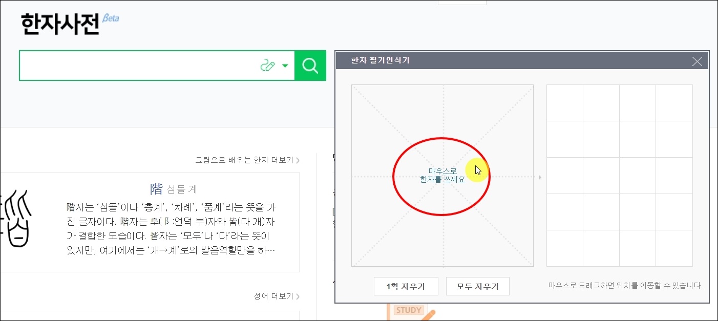검색창 옆에 한자 필기인식기 프로그램이 나타났습니다. 여기에 마우스로 문자를 그리기만 하면 되는데요. 찾아보고 문자를 여기에 그려보세요.
