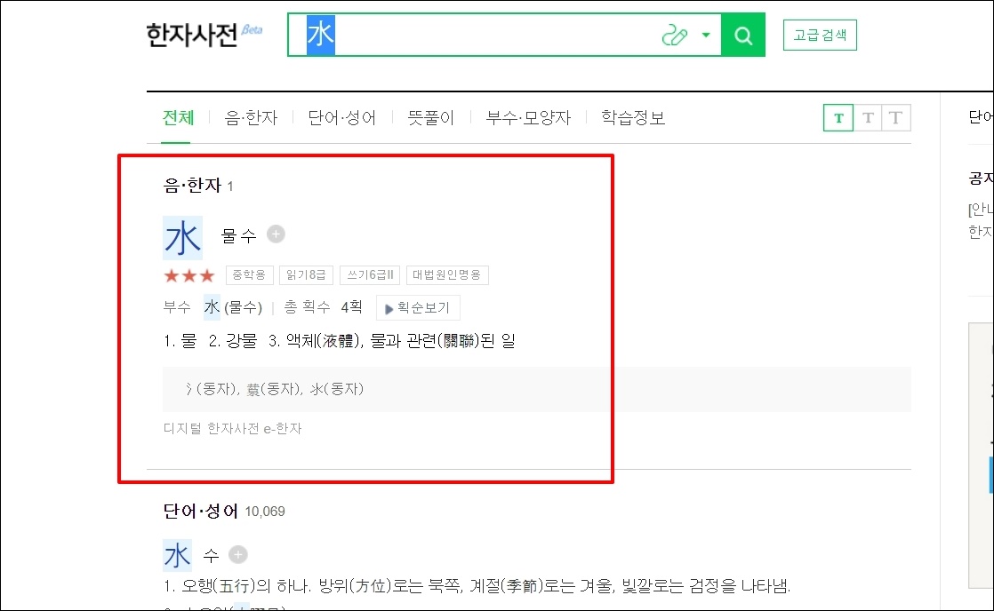 저는 "물 수" 한자에 대해 좀 더 자세히 알아보고 싶어서 선택했는데요. 이렇게 난이도, 대법원인명용 여부, 부수, 모양자, 총획수 등의 사전 정보를 확인할 수 있습니다. 여기에 더하여 해당 한자가 담고 있는 뜻도 확인이 가능한데요. 일반적으로 사용하는 옥편보다 꽤 많은 뜻을 살펴볼 수 있습니다.