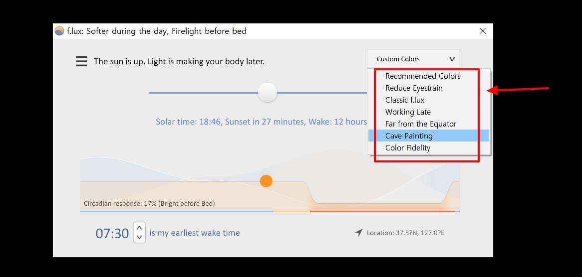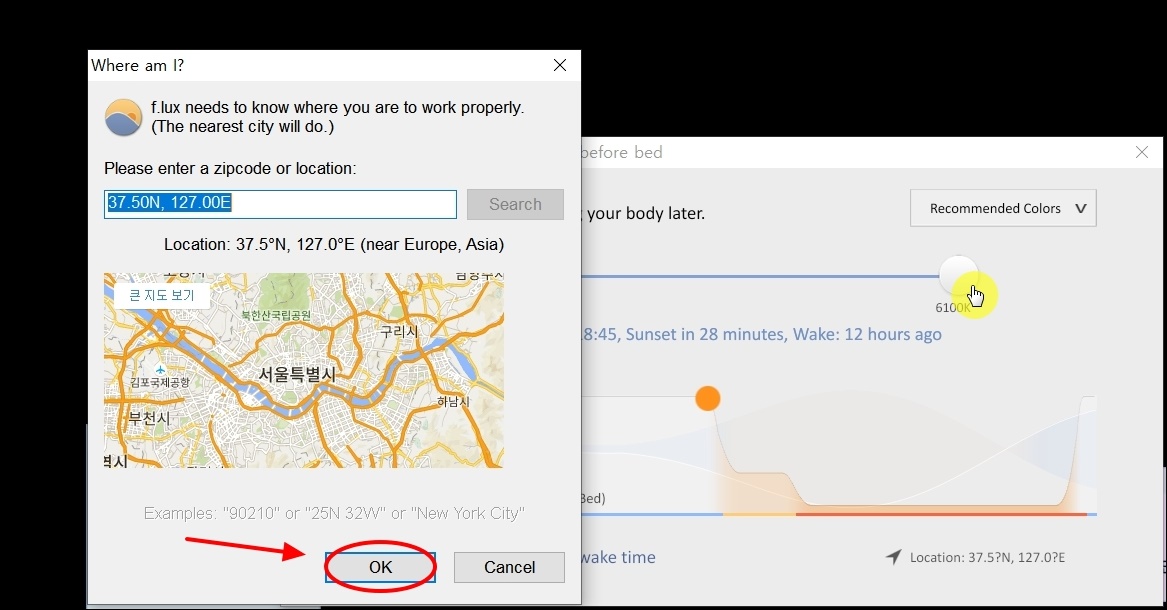 설치가 완료된 후 처음 실행하면 위치를 설정할 수 있는 창이 나타나는데요. 내 위치를 프로그램이 알고 있으면 해가 뜨는 시각과 지는 시각을 감안하여 자동으로 컴퓨터 화면밝기 조절을 해줍니다. OK 버튼을 누르면 자동으로 위치 설정이 완료가 되는데요.