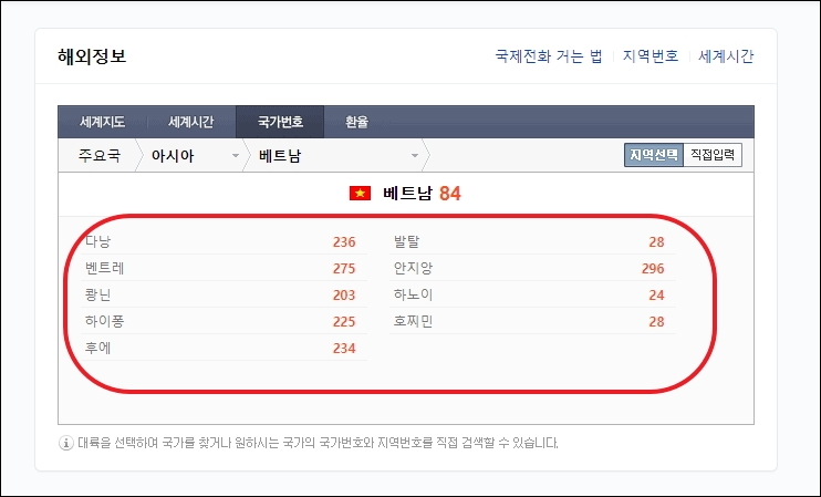 저는 "베트남"을 클릭했는데요. 다낭, 발탈, 벤트레, 쾅닌, 하이퐁, 후에, 하노이, 호찌민 등 여러 지역의 지역번호를 확인할 수 있습니다.