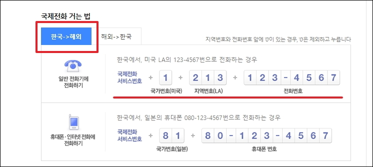 첫 번째의 경우에는 국제전화 서비스 번호, 국가번호, 지역번호, 전화번호를 순서대로 입력하면 되고요. 상대방 휴대폰으로 전화 걸 때에는 지역번호를 빼고 번호를 누르면 돼요.