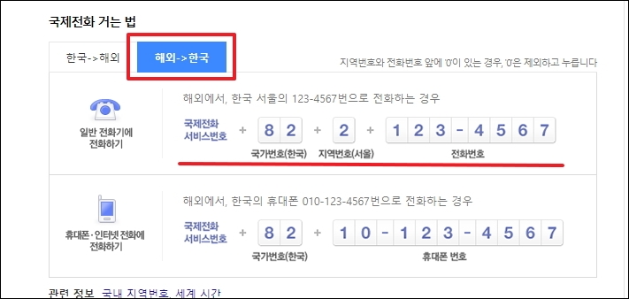 이번에는 해외에서 한국으로 전화를 걸 때에요. 이 때에도 한국에서 해외로 걸 때와 동일한 방식입니다. 한국의 국가번호와 각 지역의 번호를 아는 것이 중요한데요. 한국의 국가번호는 "82"번이고, 서울은 "02"입니다. 해외에서 전화를 걸 때에는 "02"에서 "0"을 뺀 "2"으로 입력해야 됩니다.