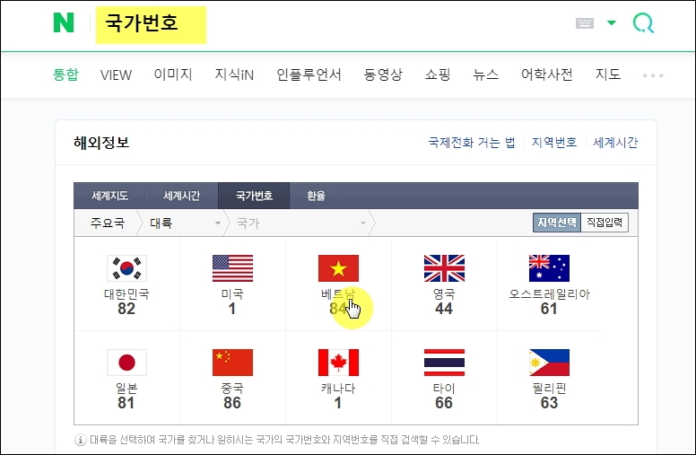 미국은 "1"번, 베트남은 "84"번, 영국은 "44"번, 오스트레일리아는 "61번" 일본은 "81"번, 중국은 "86"번으로 나오네요. 여기에서 지역번호를 알고 싶다면 나라 이름 또는 국기 이미지를 클릭하면 됩니다.