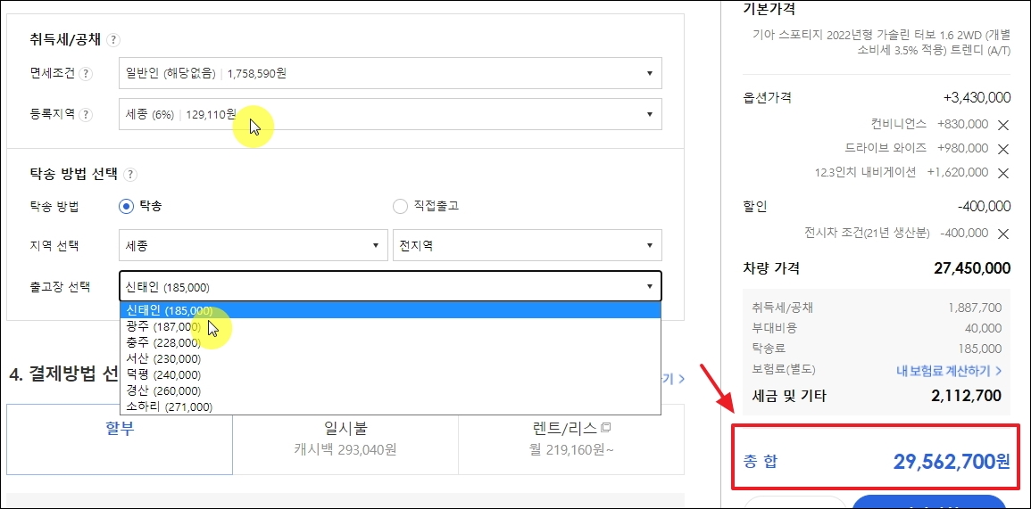 ▼기아자동차를 포함한 대부분의 제조사의 차량을 구매할 때 취득세, 탁송료 등이 발생합니다. 이러한 부분은 본인에게 맞는 것을 선택하면 자동으로 계산해 줍니다. 여기까지 진행하고 나면 홈페이지 우측 부분에서 가격표를 만나볼 수 있습니다. 기아자동차 대리점에서 스포티지 신차를 구매할 때 발생하는 최종 구매 비용과 거의 같다고 보면 됩니다.